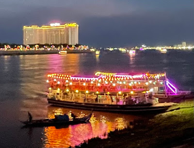 DECEMBER 29th REFLECTION: The silhouette of the small sampan in the foreground is only visible due to the reflection of the lights on the sunset cruise boat behind it. Riverside atmosphere is enhanced by the refections